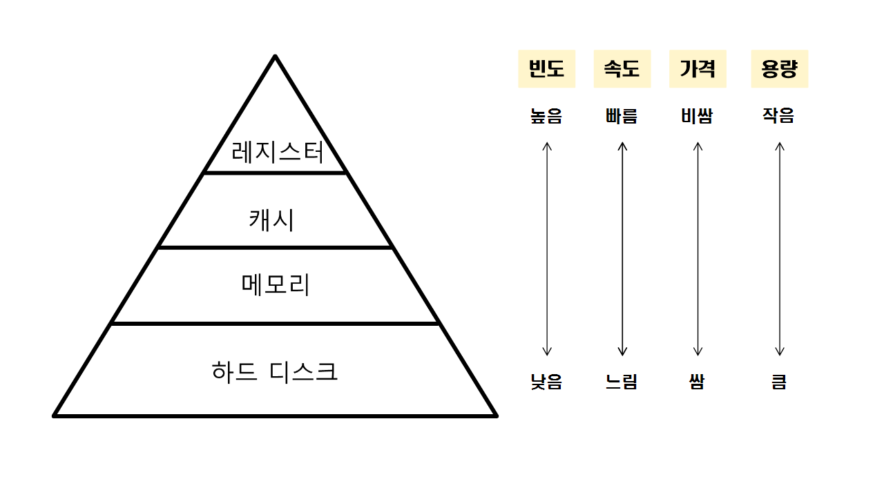 상위부터 레지스터, 캐시, 메모리, 하드디스크로 나뉜다.